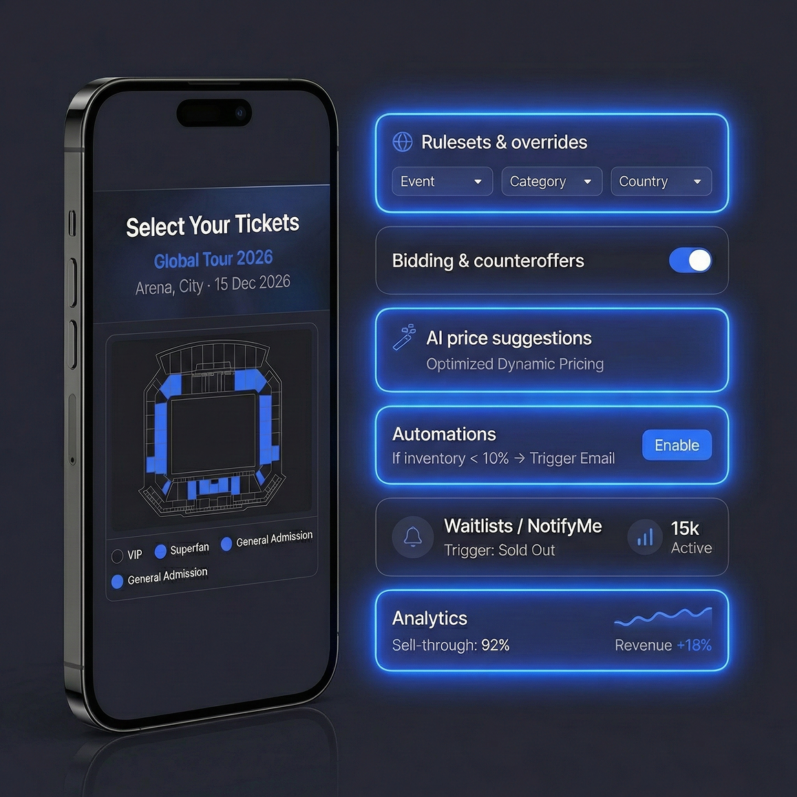 Track real-time performance across listings, sales, revenue, and demand. Understand fan behavior, optimize pricing, and rely on dedicated customer success to support your expansion.